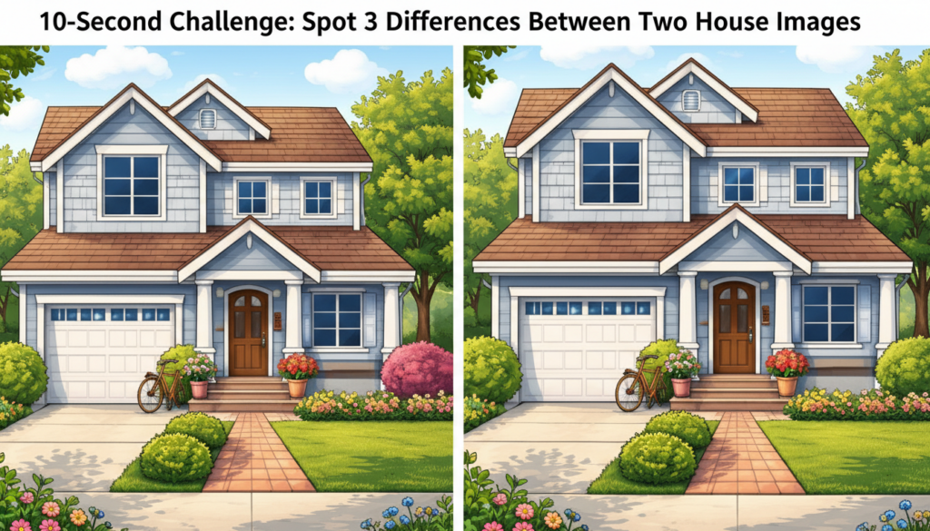 These puzzles test your ability to pay attention and focus while also testing your ability to carefully observe. This article has a 10-second test for your visual skills. In just ten seconds, you need to find three things that are different between two pictures of a pretty house. You don’t have much time, so you need to get to work.