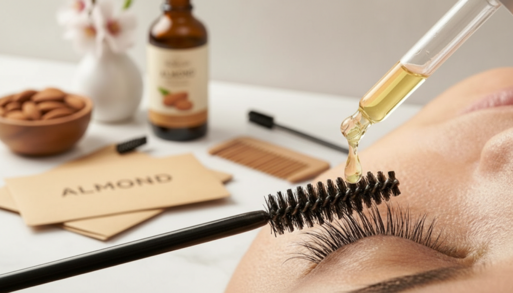 It’s helpful to know what almond oil can do before you start. Keratin makes up most of each lash and brow, and they grow from follicles that need food and a healthy environment. Almond oil can’t make new follicles, but it can help the health of the hairs and follicles that are already there. Sweet almond oil, which is often used in beauty products, has vitamin E and fatty acids like oleic and linoleic acid. These nutrients keep moisture in, which keeps delicate hairs from breaking and becoming brittle.