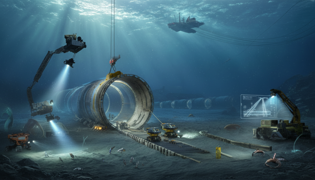 The basic move is surprisingly easy: you break the impossible down into smaller, repeatable tasks. At staging ports on both continents, huge concrete and steel tunnel pieces are made like Lego pieces, with sensors, insulation, and tracks inside. Robotic cranes guide these pieces to the seabed after they are floated out on special barges and weighed down. Submersible drones push and lock each section into place along a trench that has been carefully surveyed on the ocean floor.