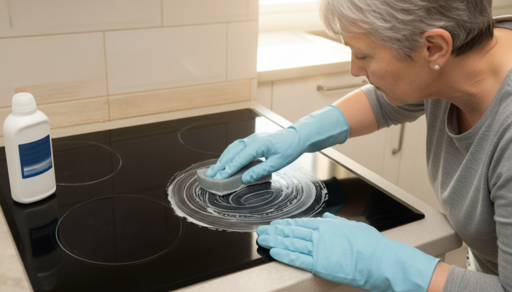 First, clean the hob well so that grease and dirt don’t get in the way of the repair. Use a soft cloth and a cleaner that is safe for the hob, then dry the surface completely. Only use mild options for polishing. For light to medium scratches, you can use baking soda paste, non-gel toothpaste, ceramic hob cream or a glass polishing compound. These products don’t grind down the surface; instead, they gently smooth it out. Use a soft microfibre cloth every time. Don’t use steel wool, sponges, or anything else that could scratch the surface.
