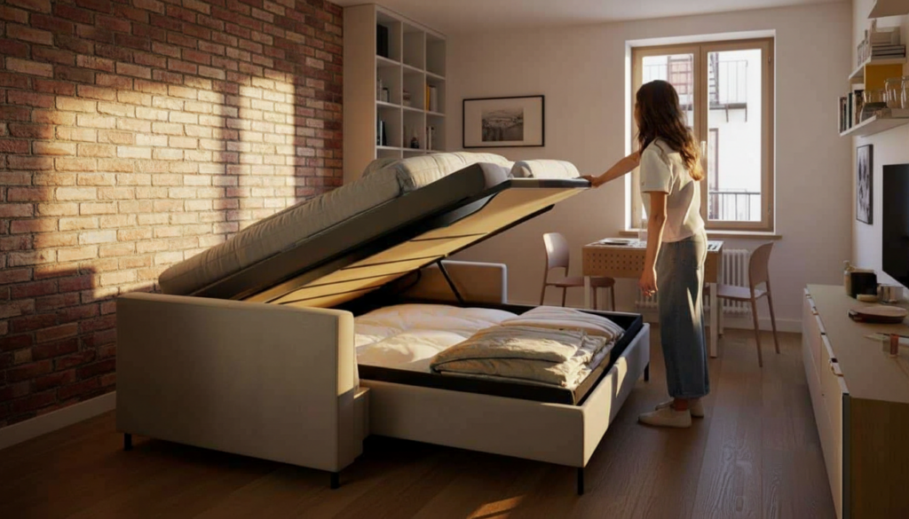Space-saving design Gliding platform, hidden storage, no bulky metal frame Helps turn a tiny living room into a flexible day–night space