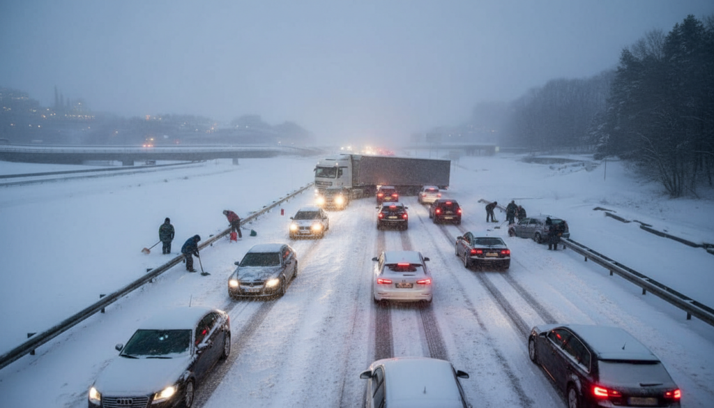 A jackknifed semi on the ring road forces all traffic into one lane. A line of frozen taillights stretches for miles in just a few minutes. Every extra inch of snow means lost time, missed connections, and delayed deliveries.
